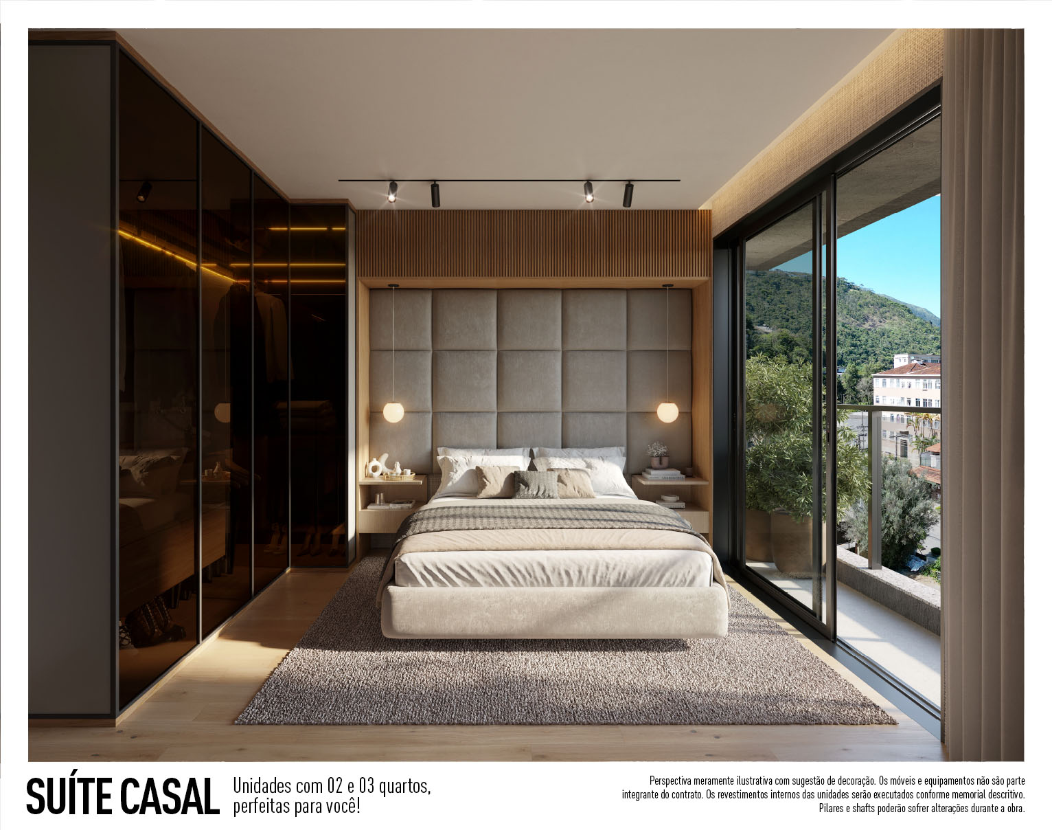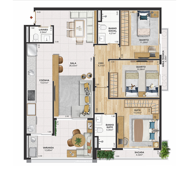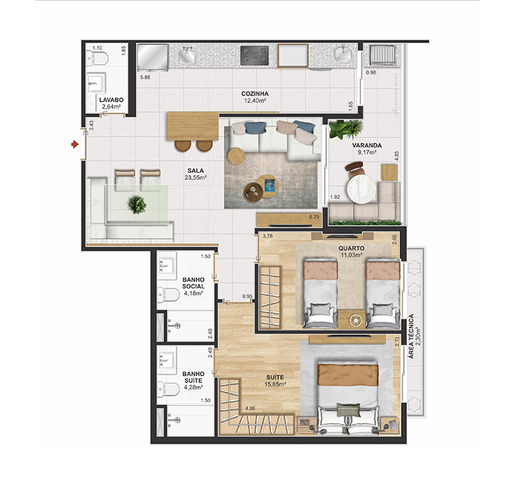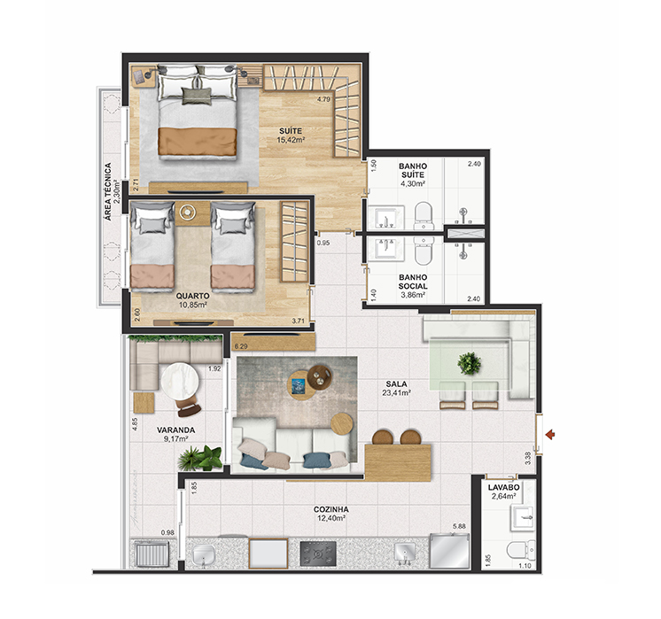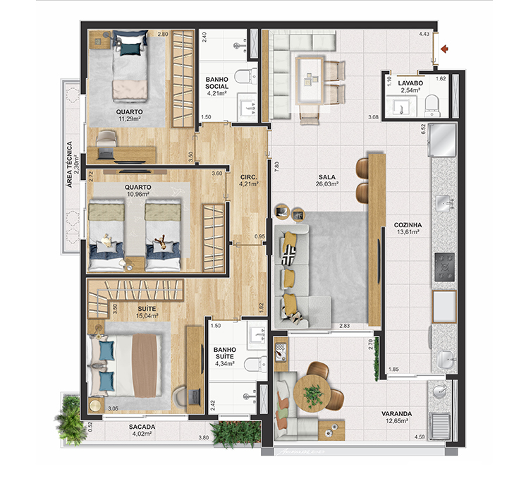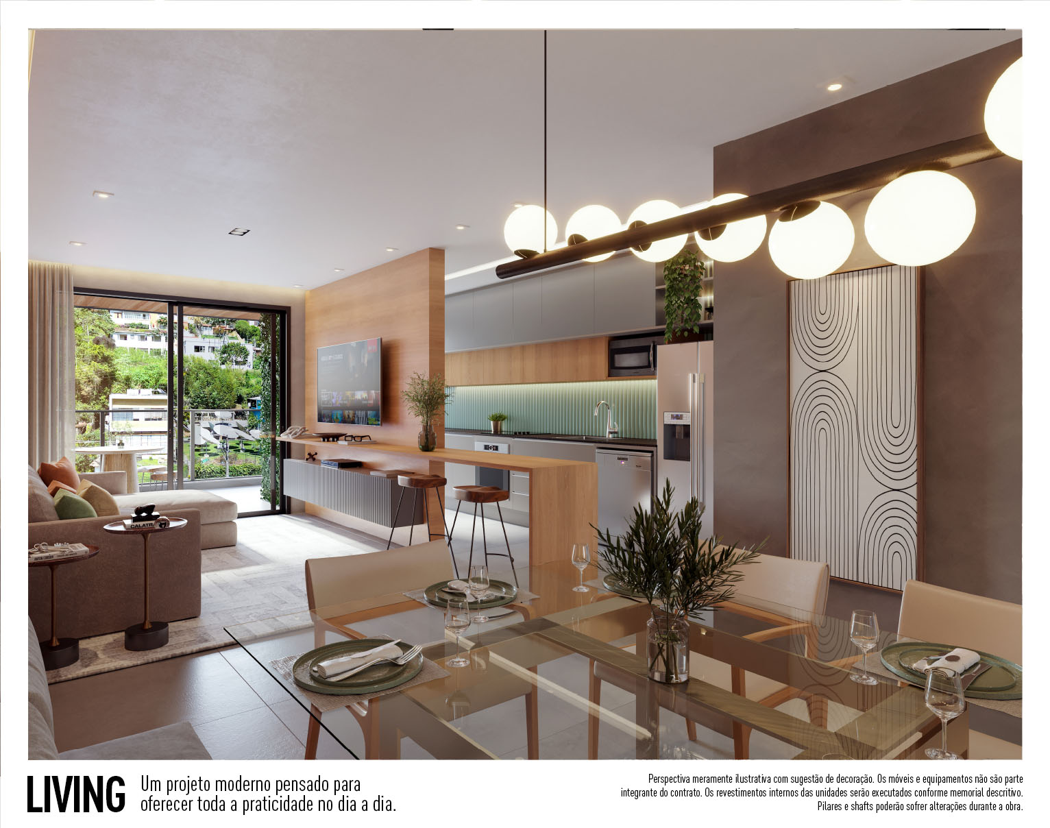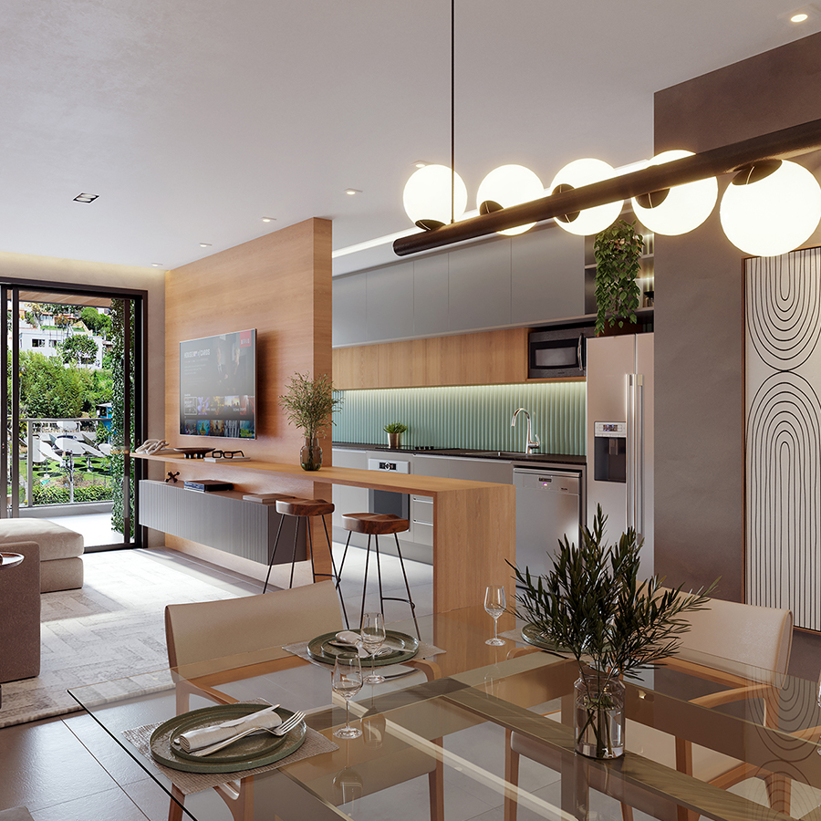 Perspectiva meramente ilustrativa com sugestão de decoração. Os móveis e equipamentos não são parte integrante do contrato. Os revestimentos internos das unidades serão executados conforme memorial descritivo. Pilares e shafts poderão sofrer alterações durante a obra.