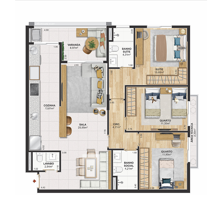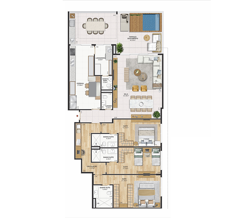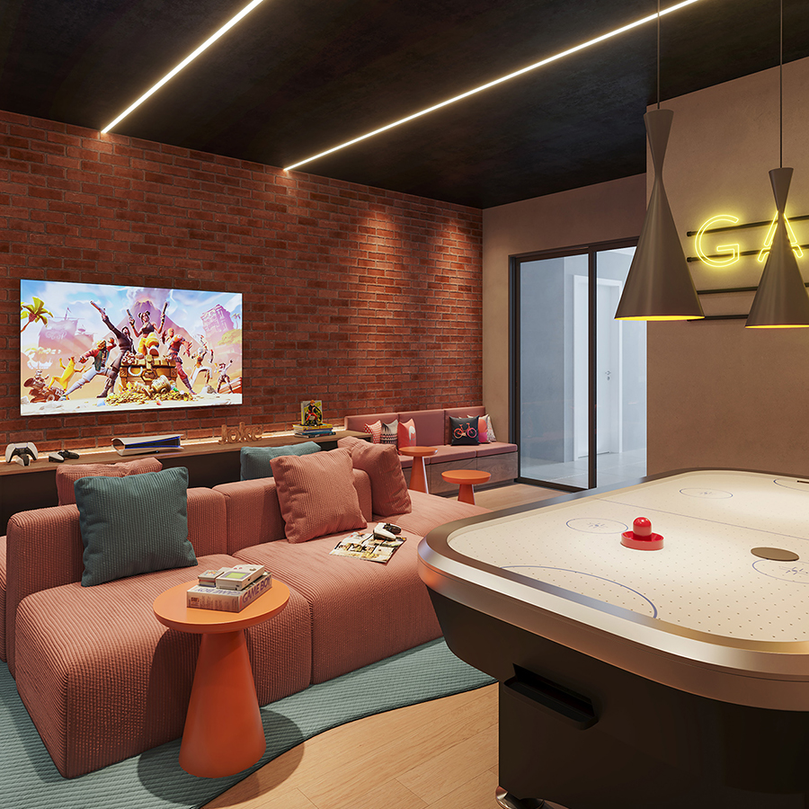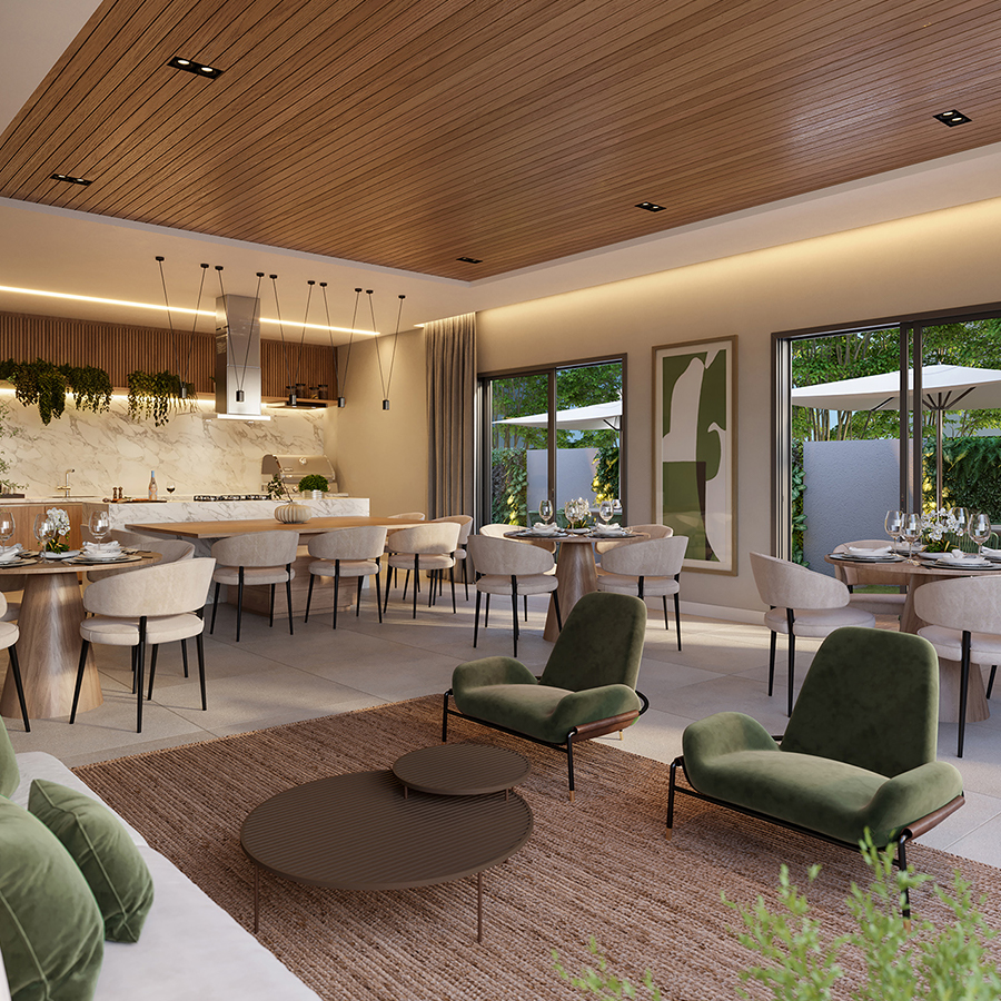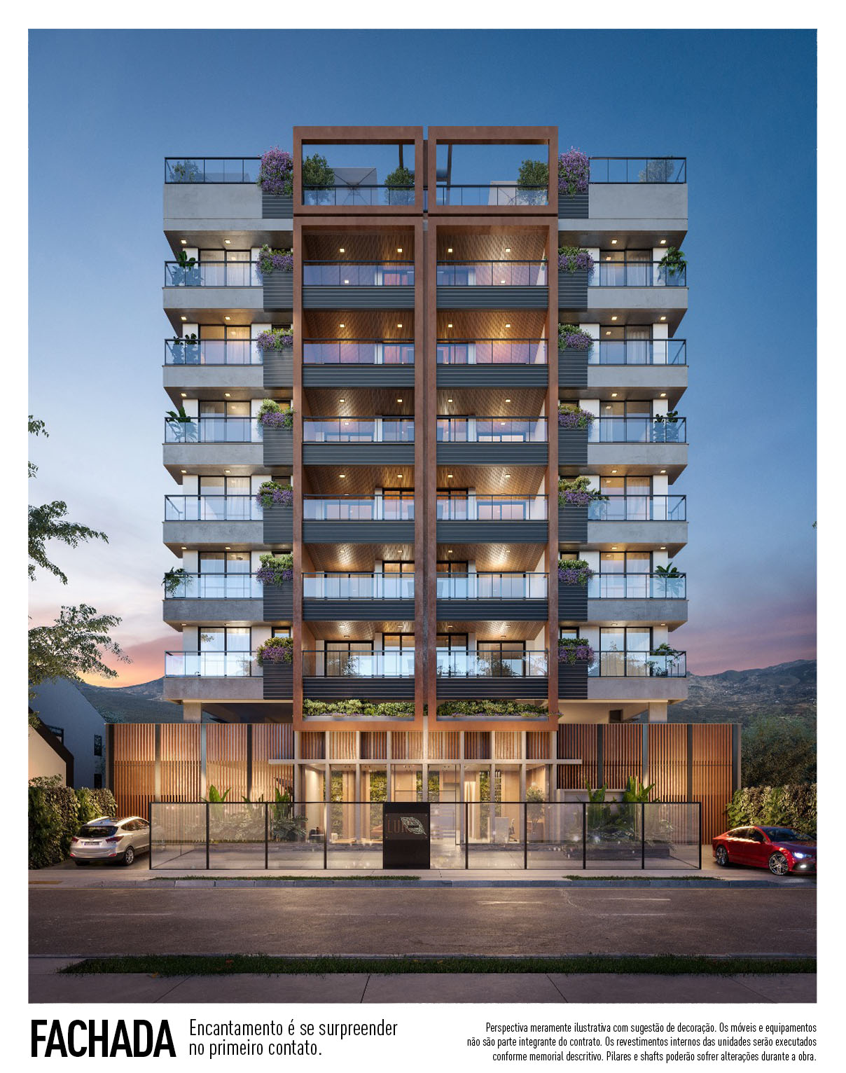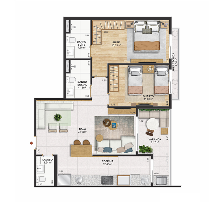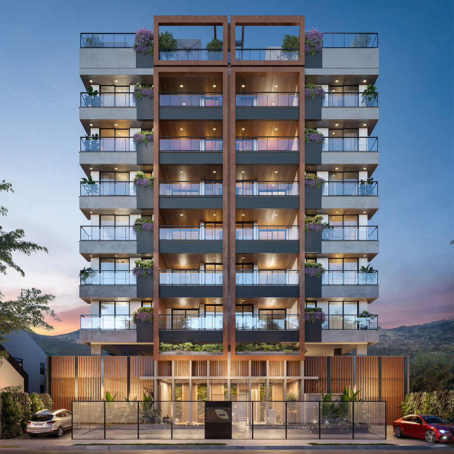 Perspectiva meramente ilustrativa com sugestão de decoração. Os móveis e equipamentos não são parte integrante do contrato. Os revestimentos internos das unidades serão executados conforme memorial descritivo. Pilares e shafts poderão sofrer alterações durante a obra.