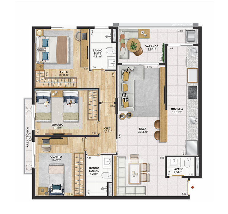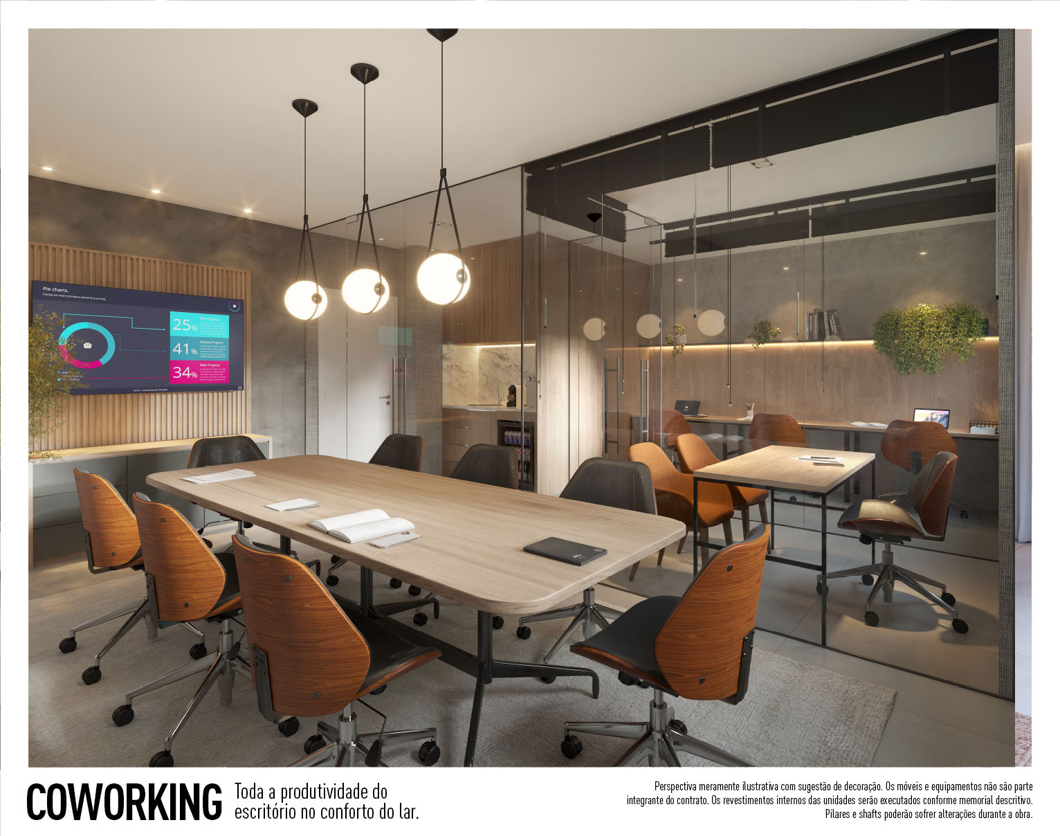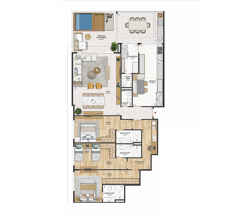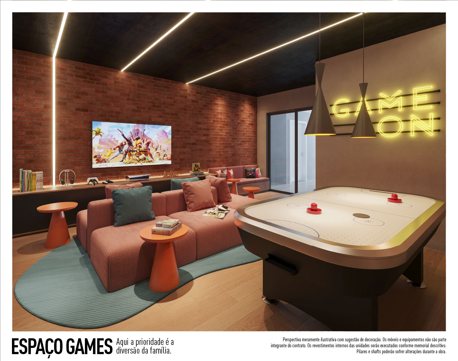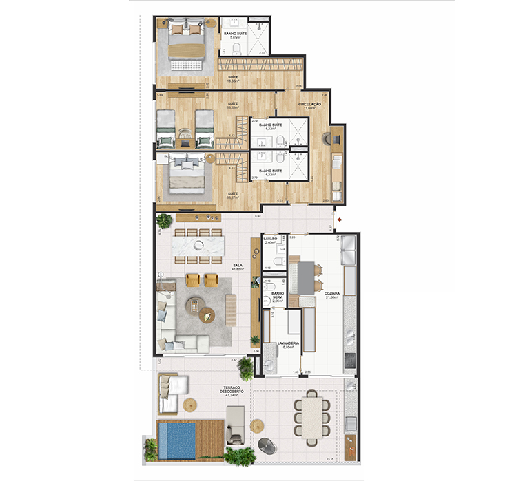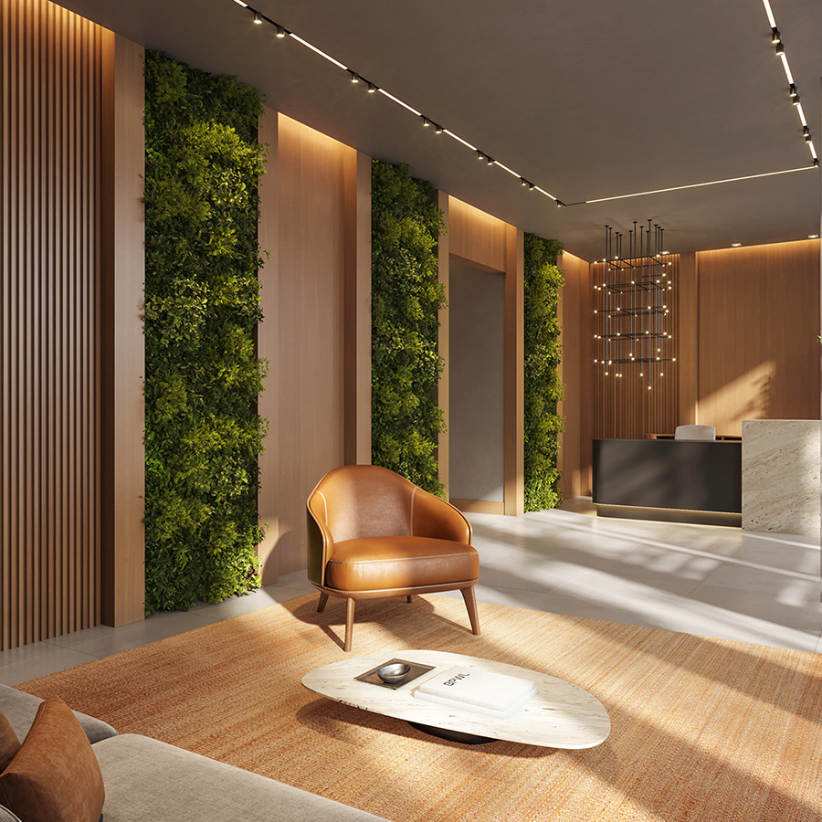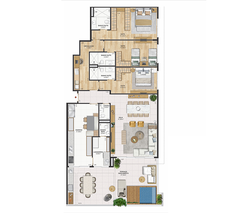 Perspectiva meramente ilustrativa com sugestão de decoração. Os móveis e equipamentos não são parte integrante do contrato. Os revestimentos internos das unidades serão executados conforme memorial descritivo. Pilares e shafts poderão sofrer alterações durante a obra.