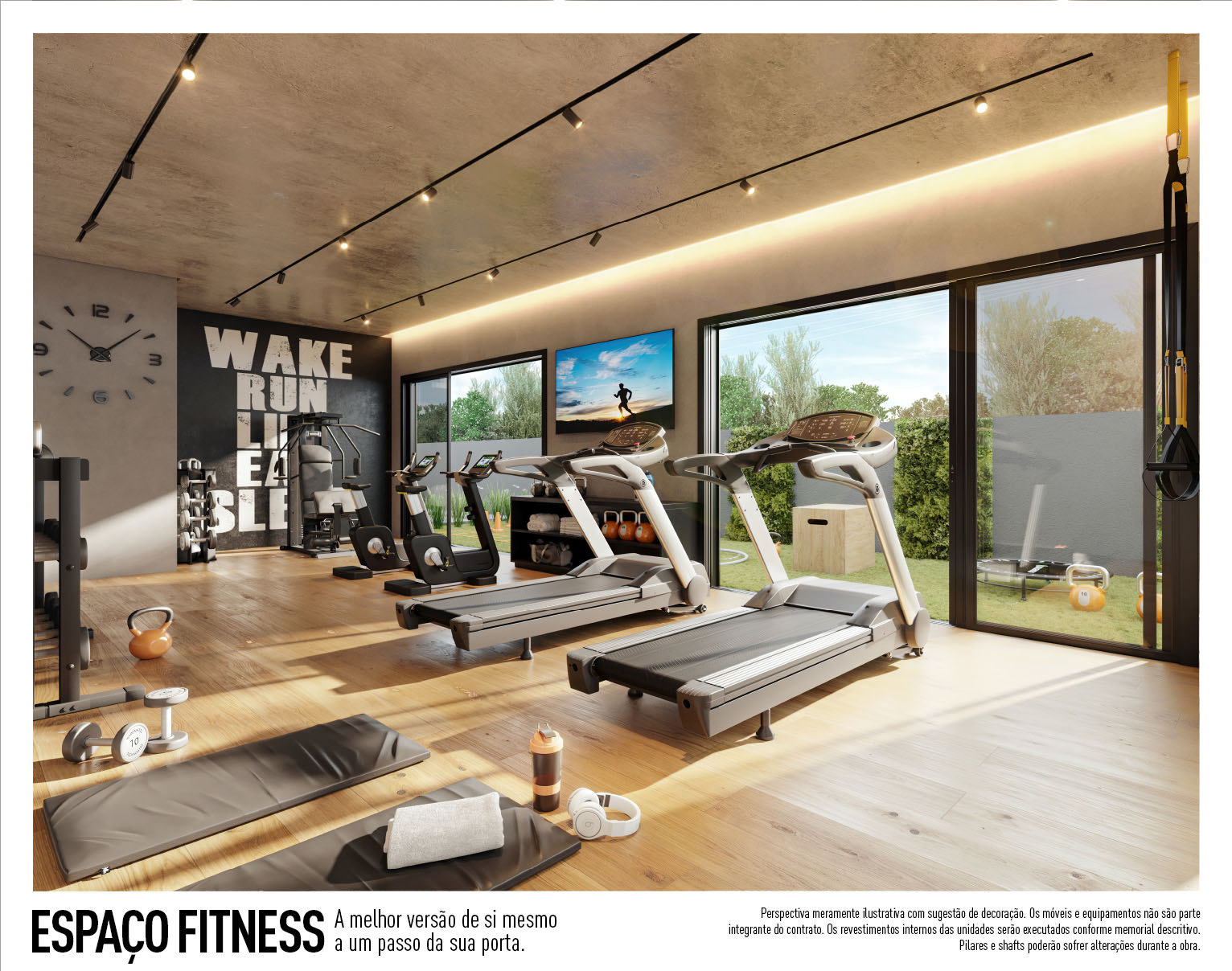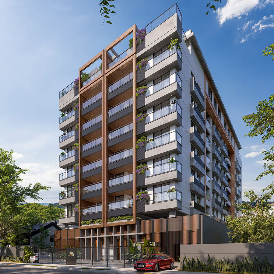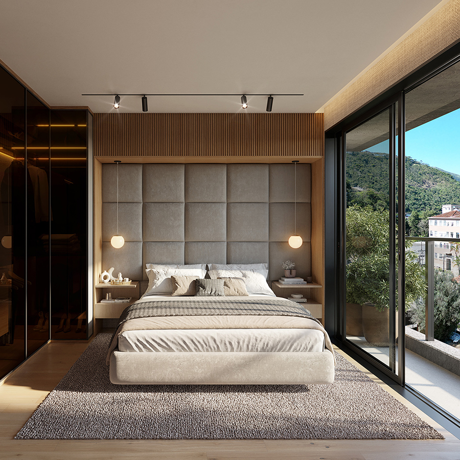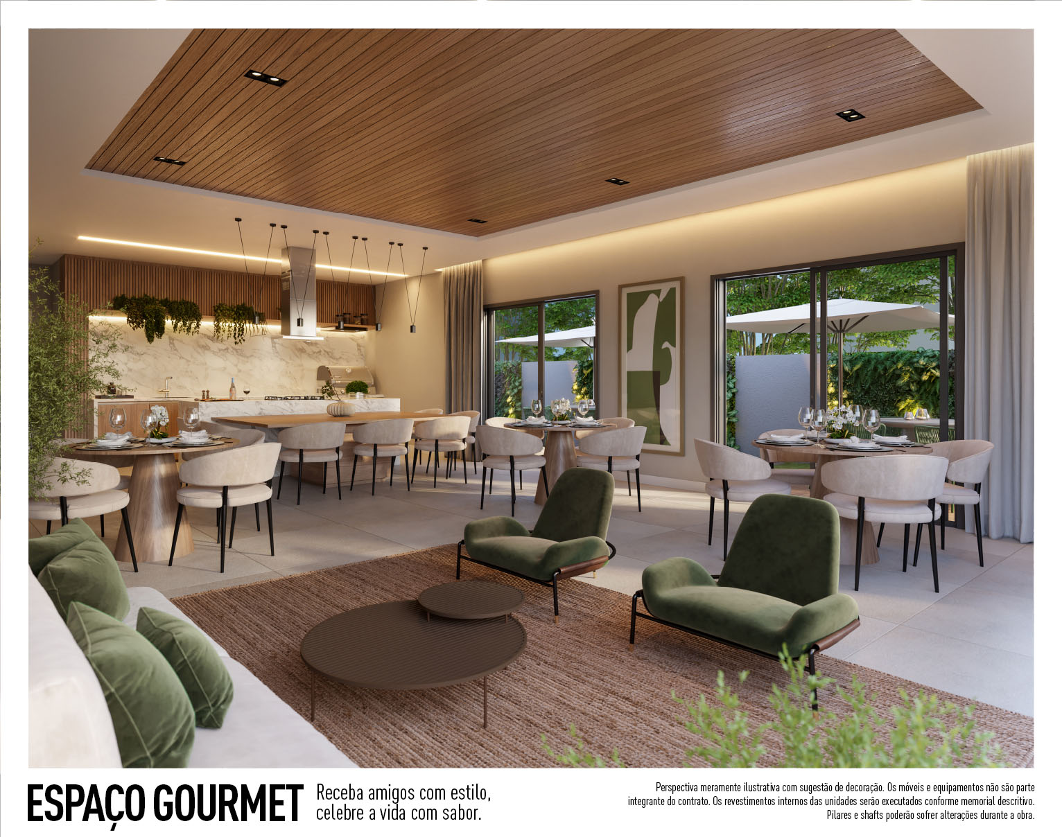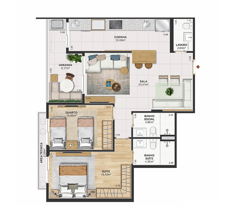 Perspectiva meramente ilustrativa com sugestão de decoração. Os móveis e equipamentos não são parte integrante do contrato. Os revestimentos internos das unidades serão executados conforme memorial descritivo. Pilares e shafts poderão sofrer alterações durante a obra.