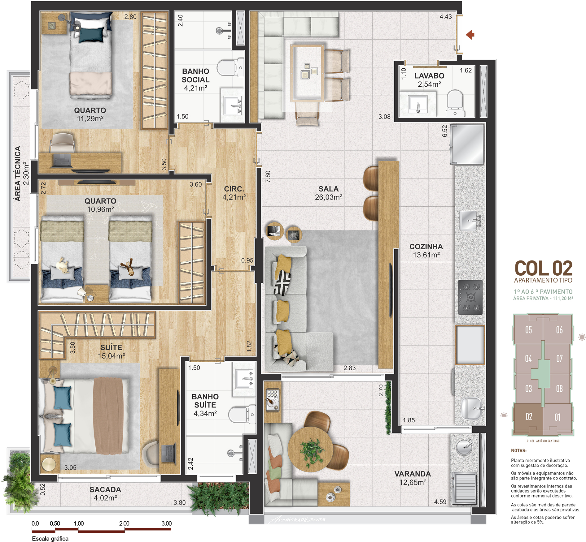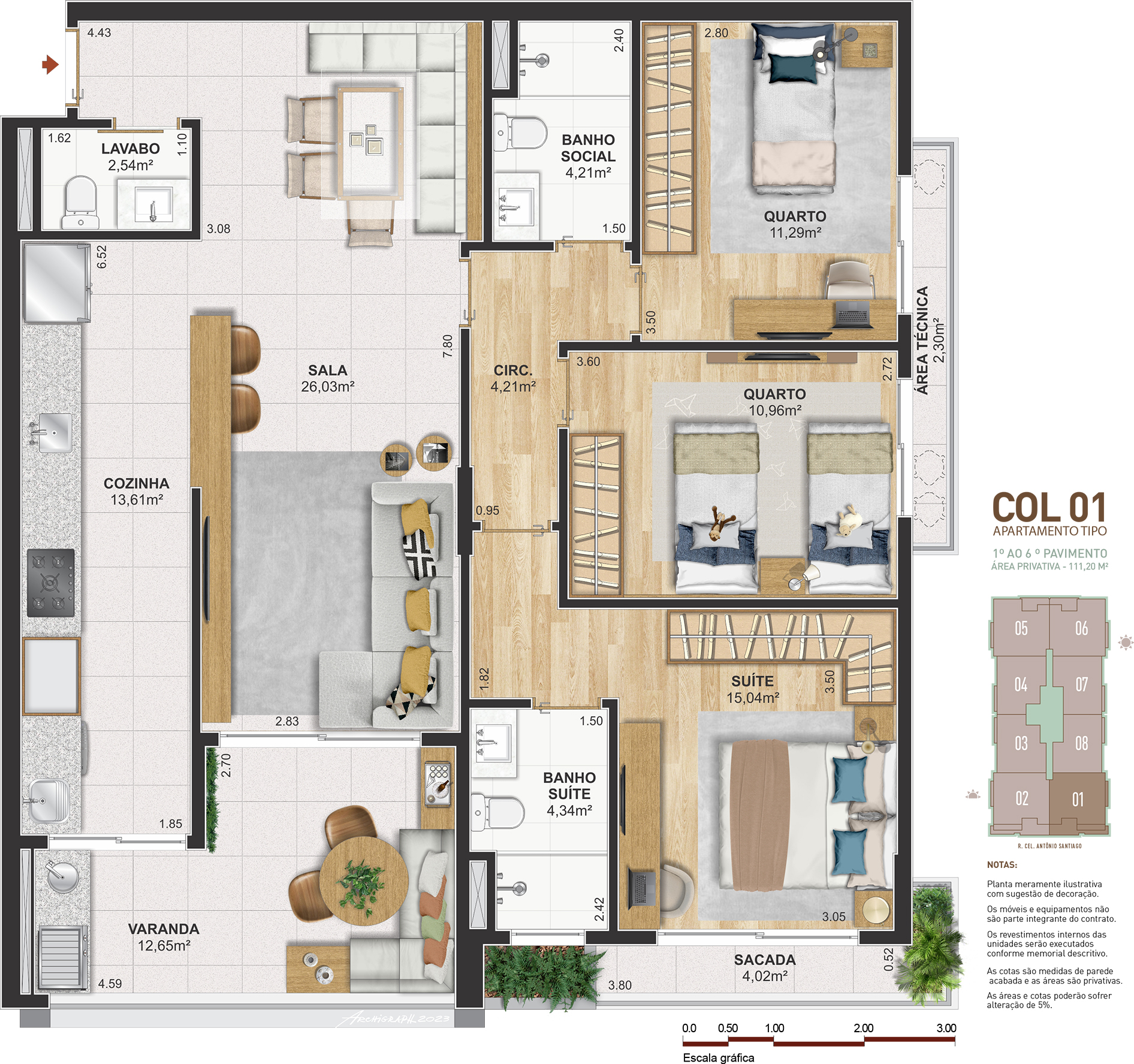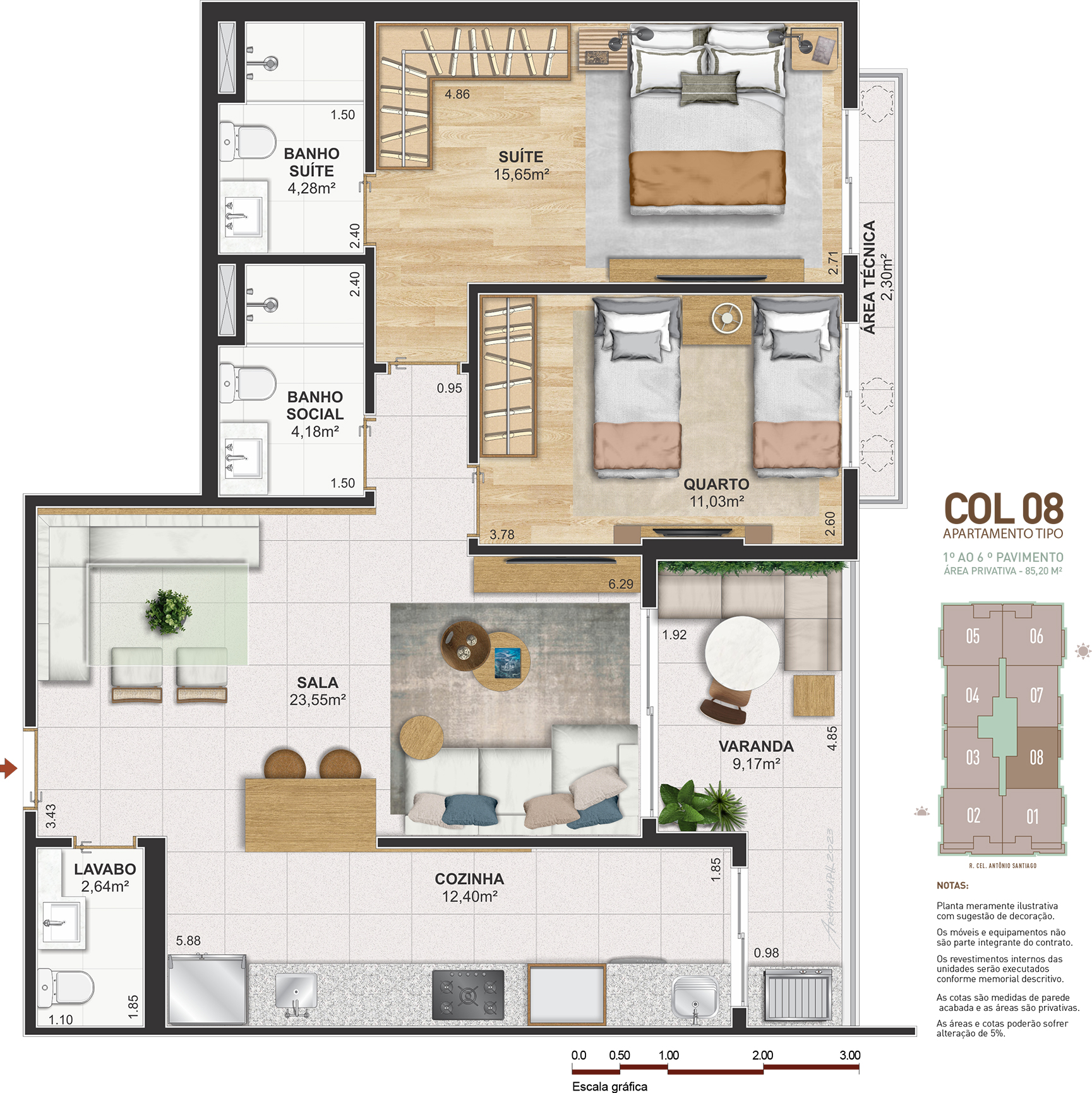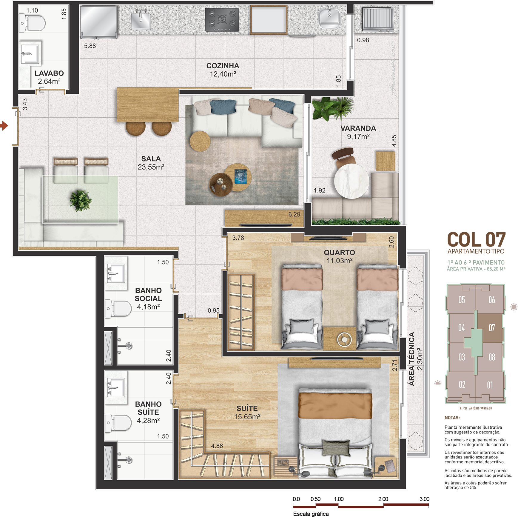 Notas: Plantas meramente ilustrativas com sugestão de decoração. Os móveis e equipamentos não são parte integrante do contrato. Os revestimentos internos das unidades serão executados conforme memorial descritivo. As cotas são medidas de parede acabadas e as áreas são privativas. As áreas e cotas poderão sofrer alteração de 5%. Pilares e shafts poderão sofrer alterações durante a obra.