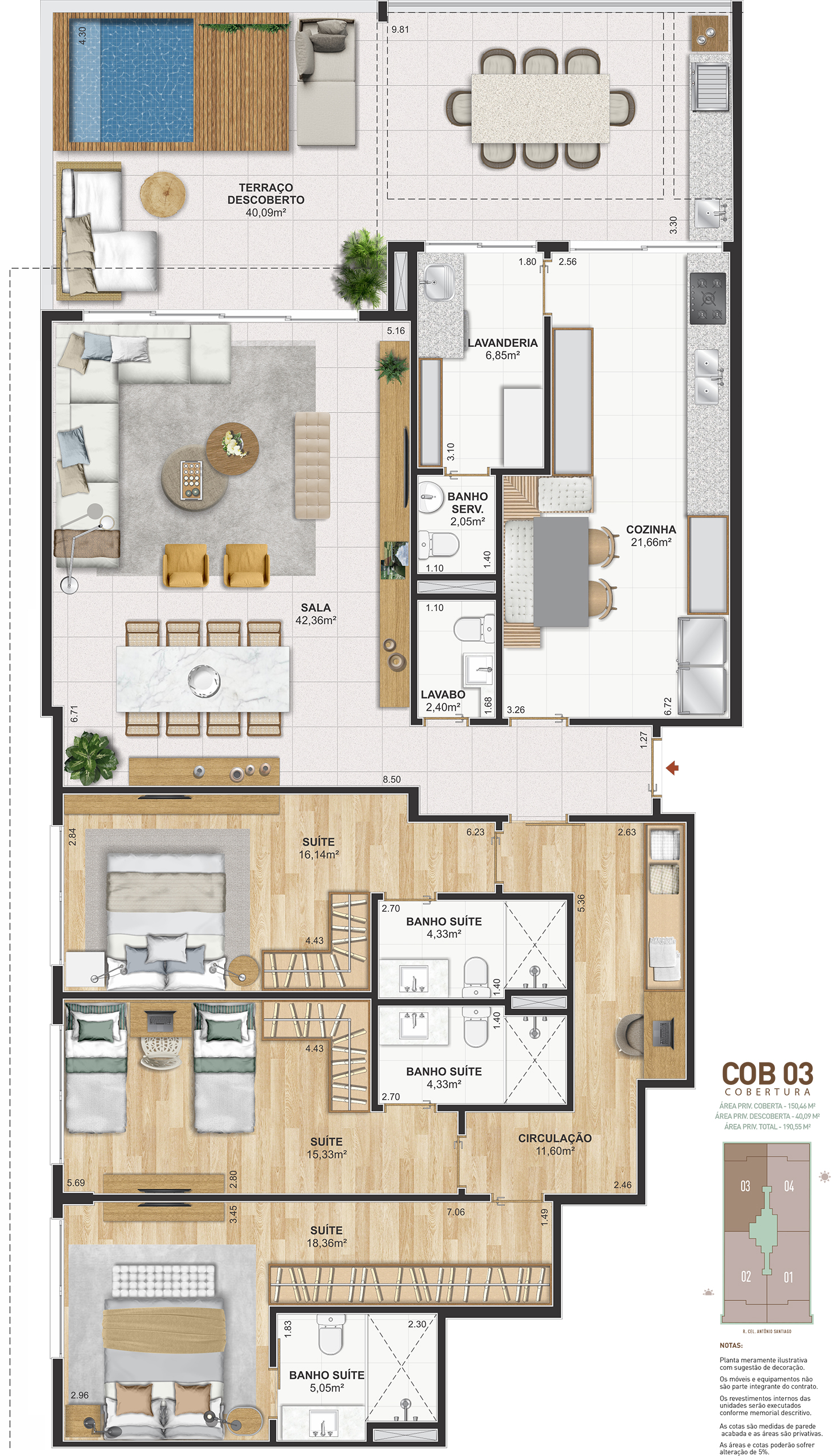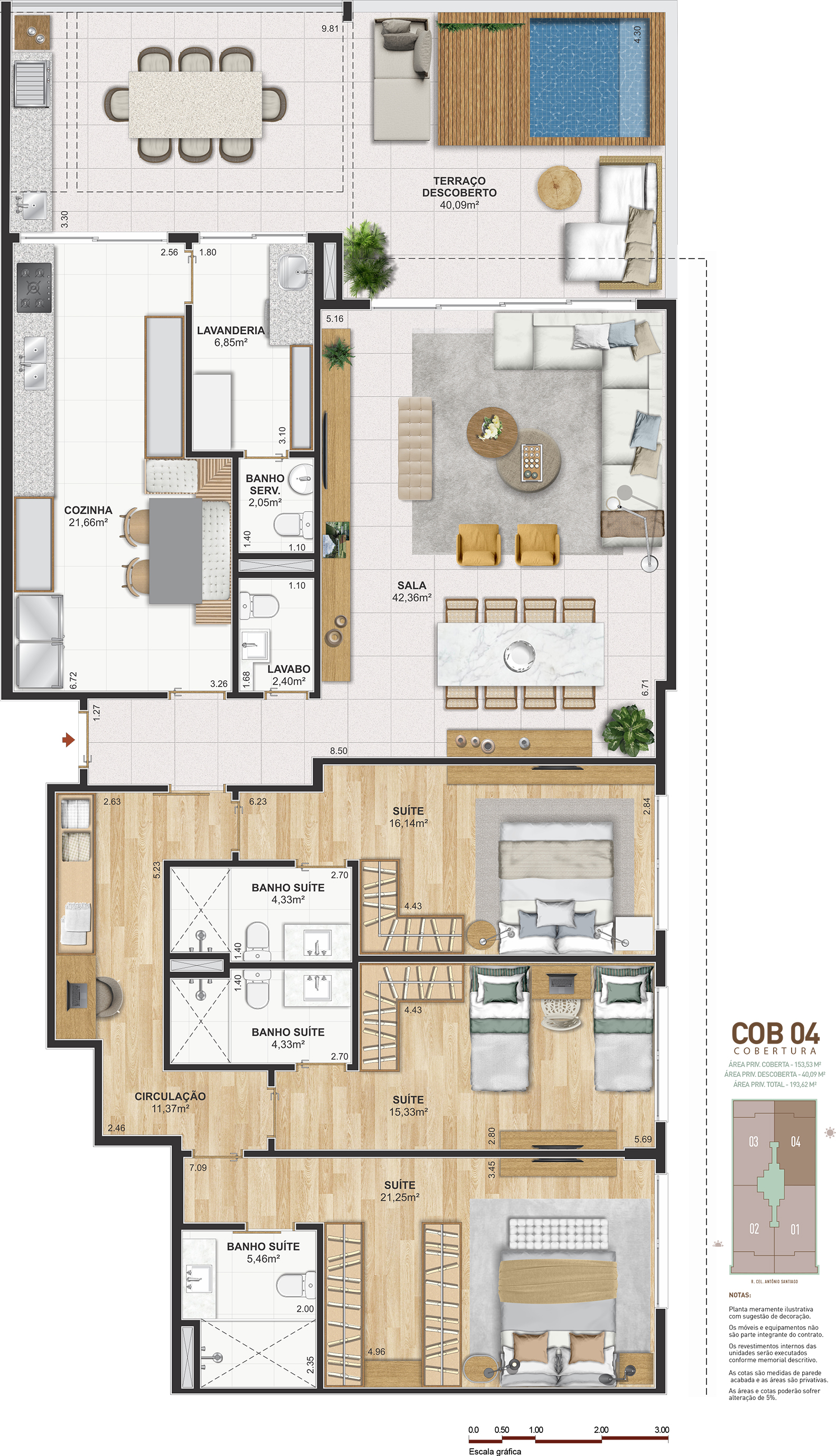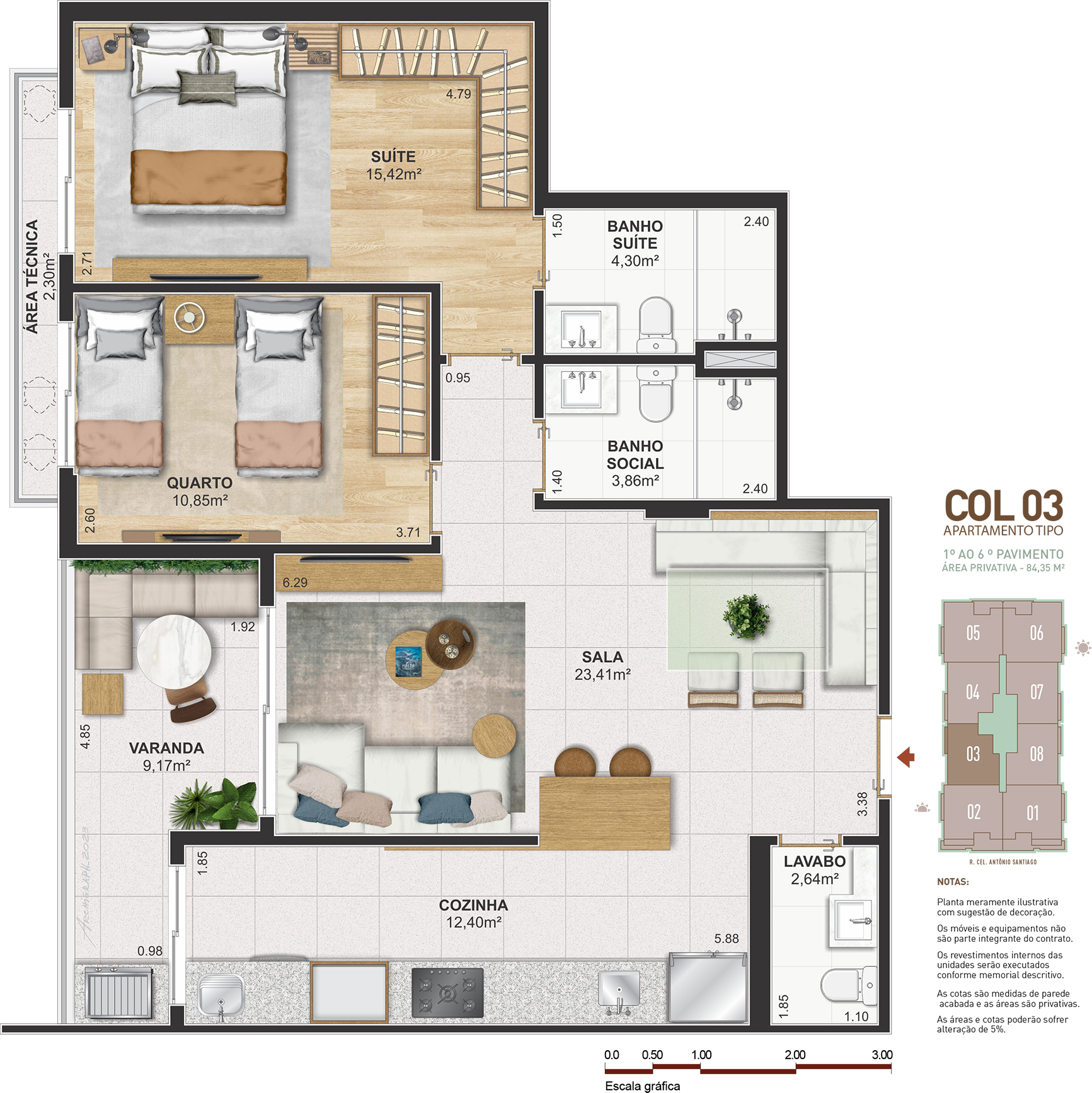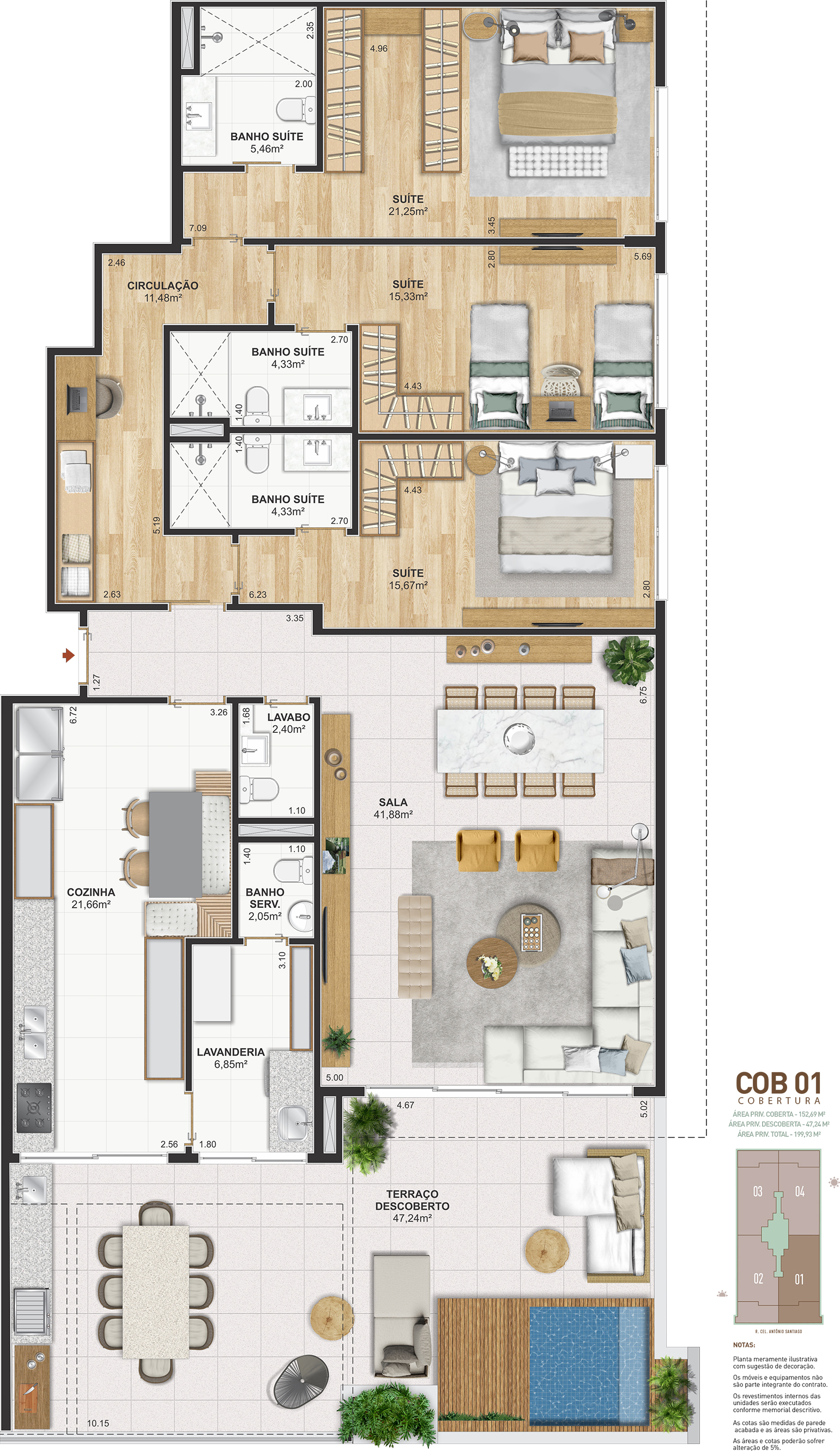 Notas: Plantas meramente ilustrativas com sugestão de decoração. Os móveis e equipamentos não são parte integrante do contrato. Os revestimentos internos das unidades serão executados conforme memorial descritivo. As cotas são medidas de parede acabadas e as áreas são privativas. As áreas e cotas poderão sofrer alteração de 5%. Pilares e shafts poderão sofrer alterações durante a obra.