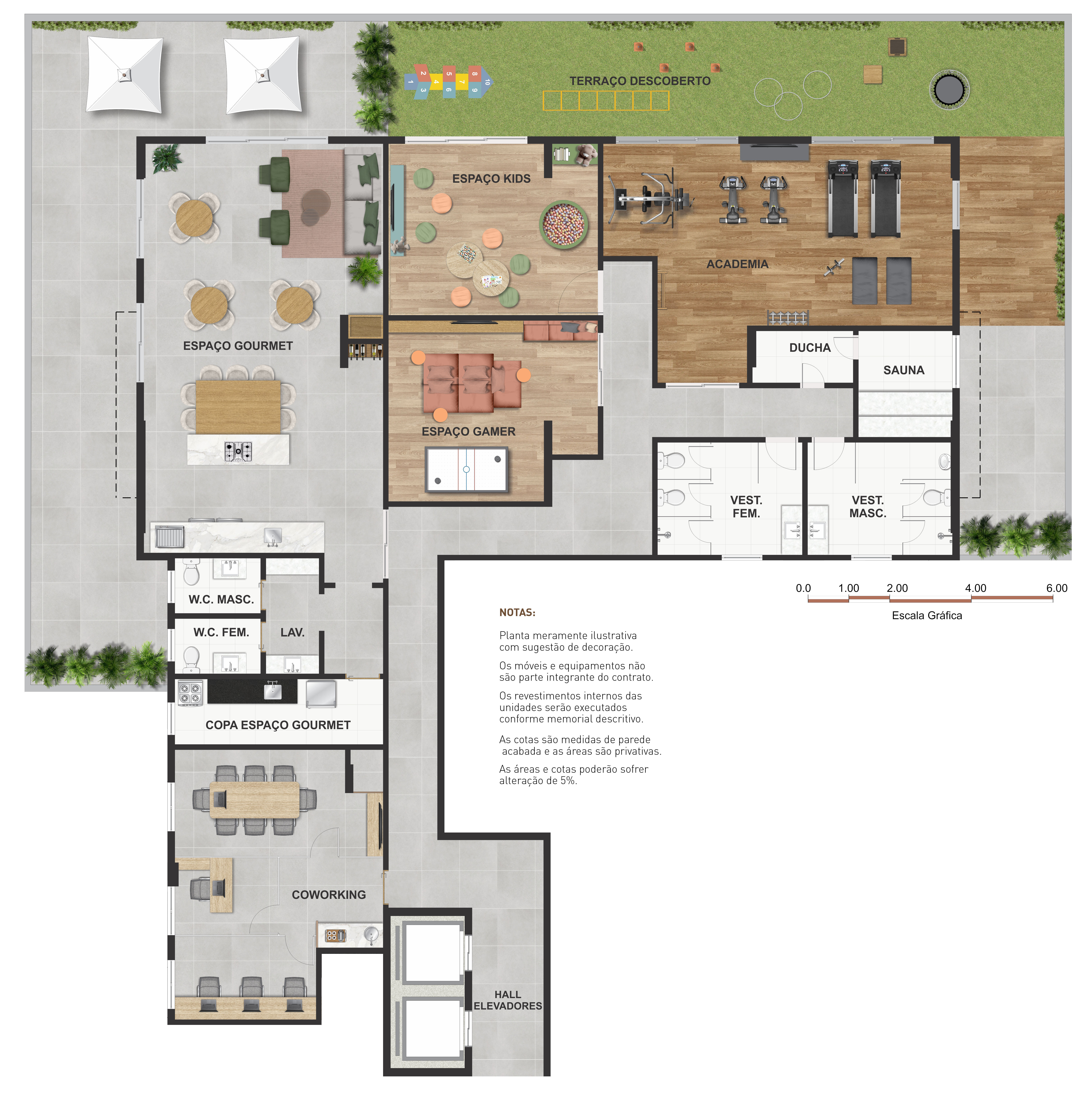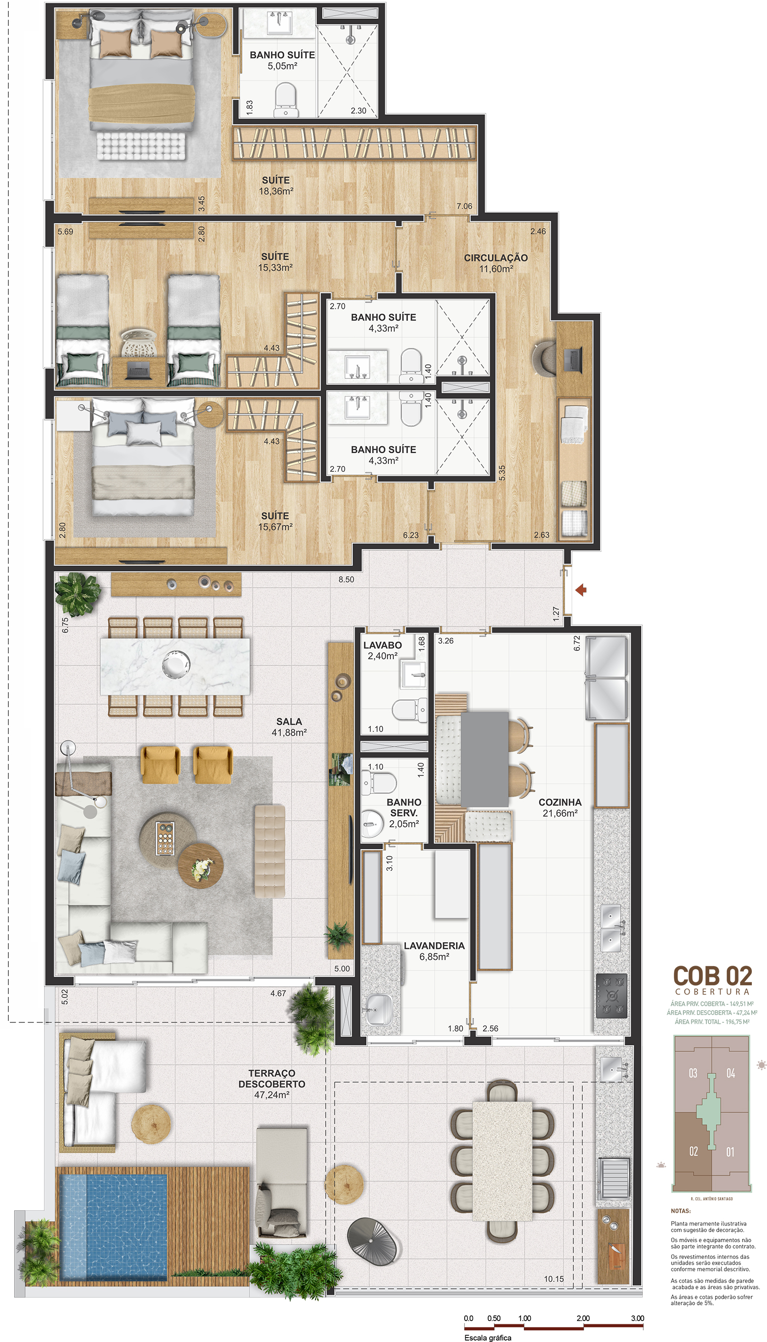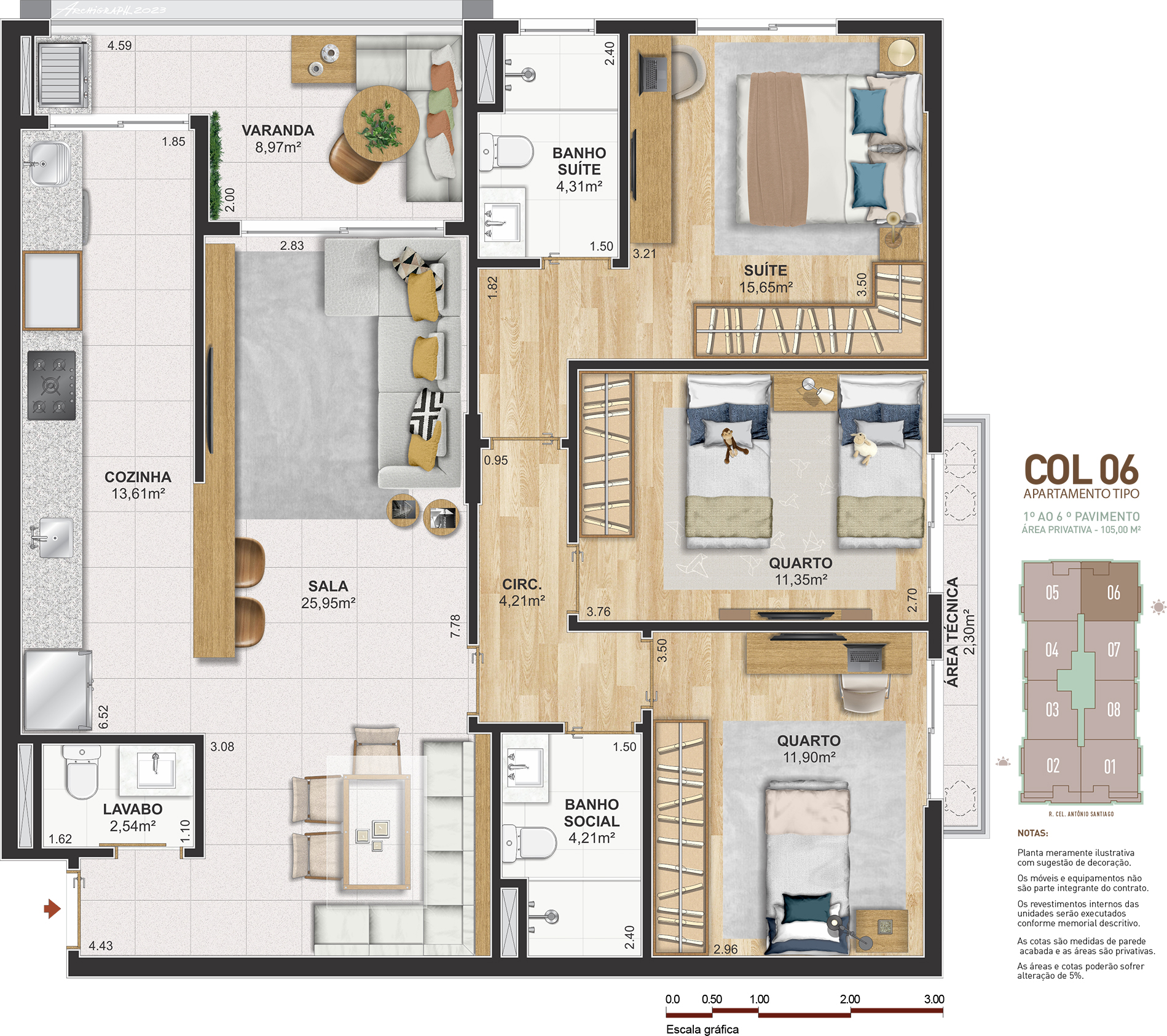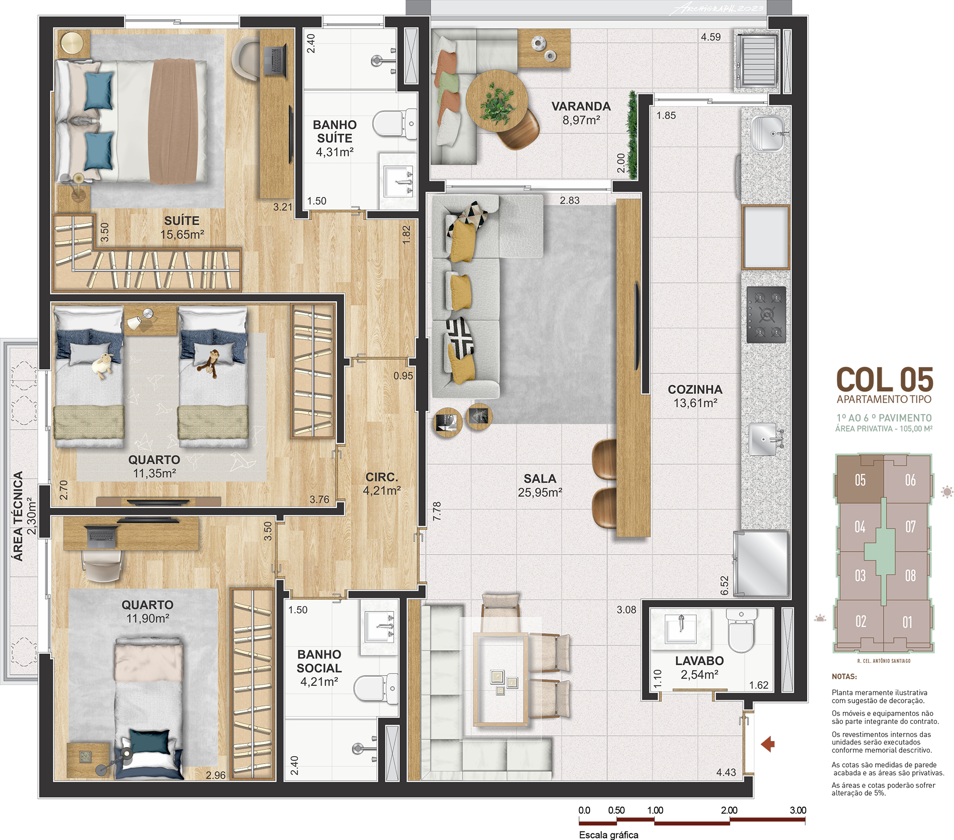 Notas: Plantas meramente ilustrativas com sugestão de decoração. Os móveis e equipamentos não são parte integrante do contrato. Os revestimentos internos das unidades serão executados conforme memorial descritivo. As cotas são medidas de parede acabadas e as áreas são privativas. As áreas e cotas poderão sofrer alteração de 5%. Pilares e shafts poderão sofrer alterações durante a obra.
